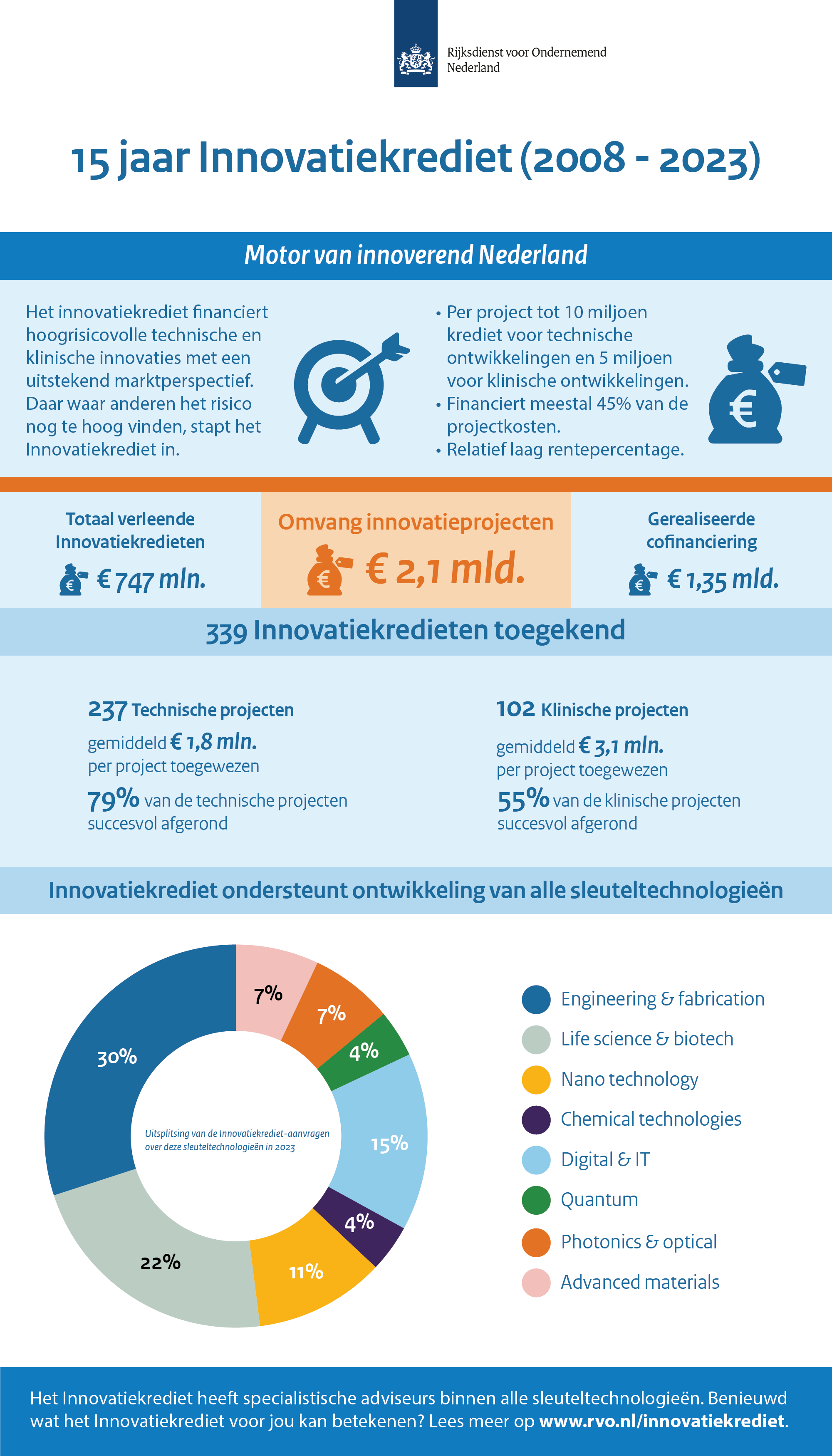 Het innovatiekrediet team is aanwezig om in gesprek met u te gaan. Wij bieden projectfinanciering voor maximaal 45% van de technische en/of klinische projectkosten voor hoog risico innovatieve nieuwe technische en/of klinische ontwikkelingen. Het innovatiekrediet betreft een subsidie die bij een succesvolle ontwikkeling wordt omgezet in een lening.